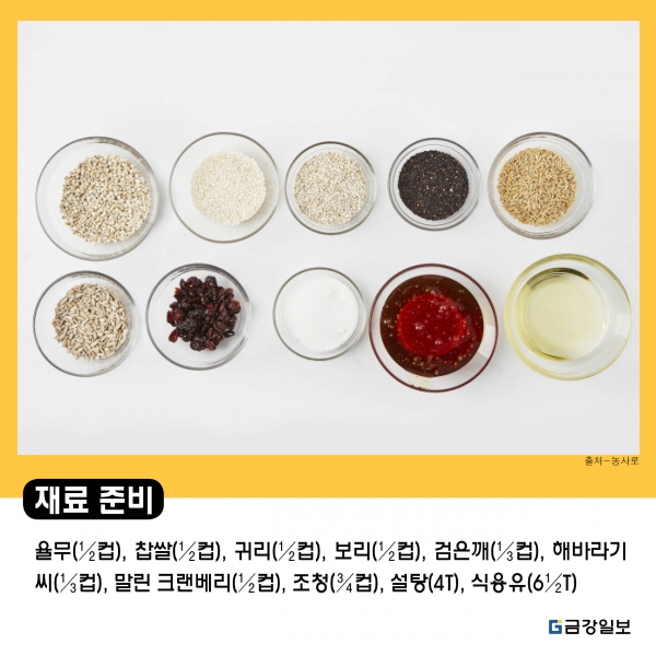 주재료 : 율무(½컵), 찹쌀(½컵), 귀리(½컵), 보리(½컵), 검은깨(⅓컵), 해바라기씨(⅓컵), 말린 크랜베리(½컵)
