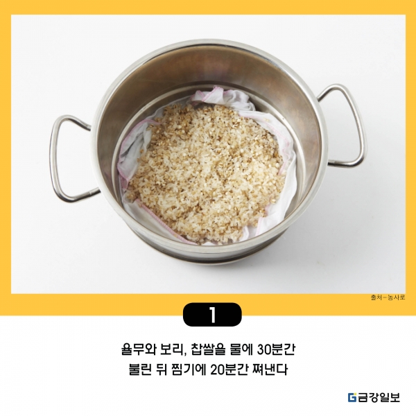 1. 율무와 보리, 찹쌀을 물에 30분간 불린 뒤 찜기에 20분간 쪄낸다.