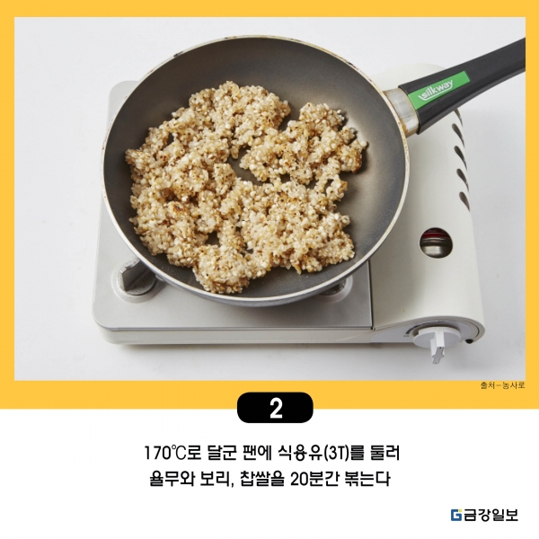 2. 170℃로 달군 팬에 식용유(3T)를 둘러 율무와 보리, 찹쌀을 20분간 볶는다.