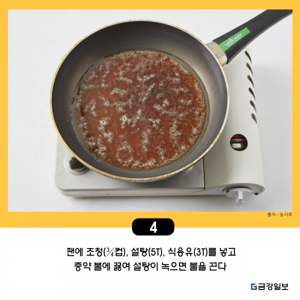 4. 팬에 조청(¾컵), 설탕(5T), 식용유(3T)를 넣고 중약 불에 끓여 설탕이 녹으면 불을 끈다.