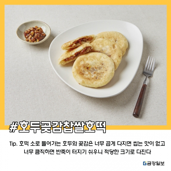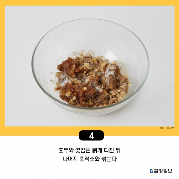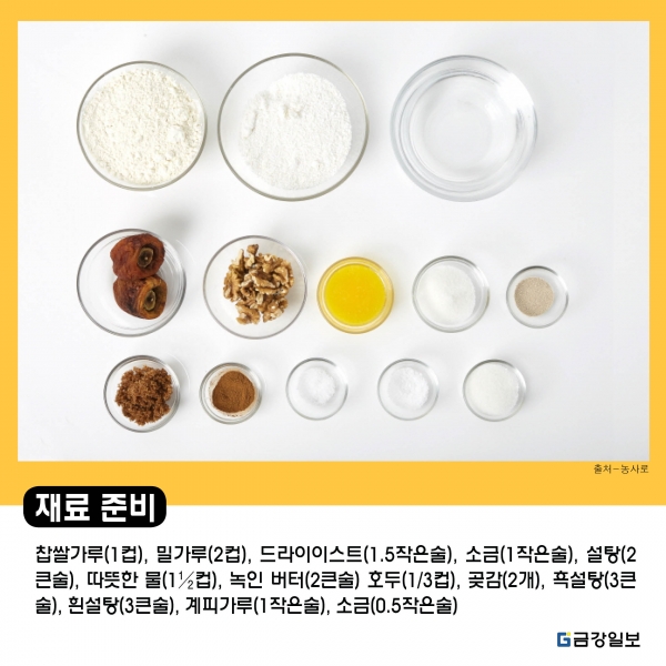 호떡소: 호두(1/3컵), 곶감(2개), 흑설탕(3큰술), 흰설탕(3큰술), 계피가루(1작은술), 소금(0.5작은술)