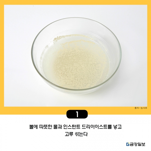 1. 볼에 따뜻한 물과 인스턴트 드리이이스트를 넣고 고루 섞는다.