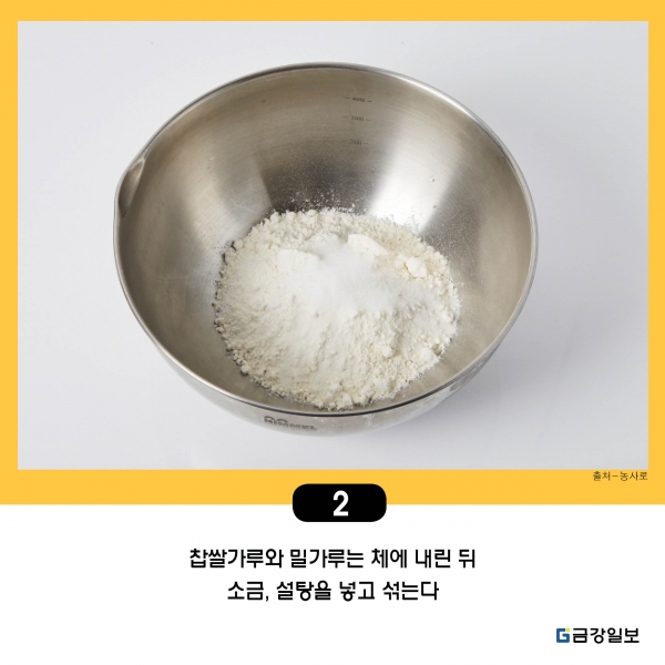 2. 찹쌀가루와 밀가루는 체에 내린 뒤 소금, 설탕을 넣고 섞는다.