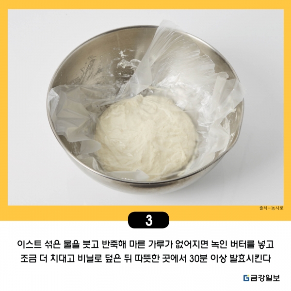 3. 이스트 섞은 물을 붓고 반죽해 마른 가루가 없어지면 녹인 버터를 넣고 조금 더 치대고 비닐로 덮은 뒤 따뜻한 곳에서 30분 이상 발효시킨다.