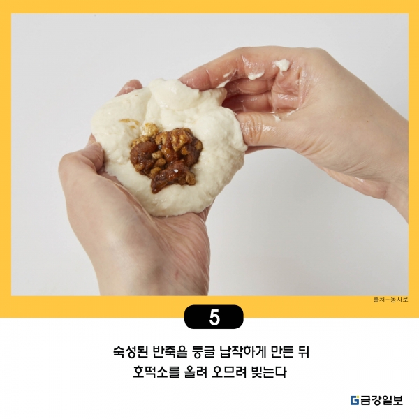 5. 숙성된 반죽을 둥글 납작하게 만든 뒤 호떡소를 올려 오므려 빚는다.