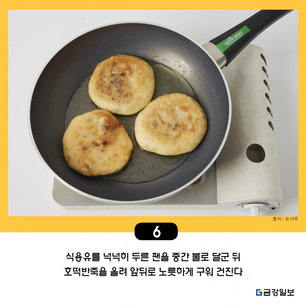 6. 식용유를 넉넉히 두른 팬을 중간 불로 달군 뒤 호떡반죽을 올려 앞뒤로 노릇하게 구워 건진다.