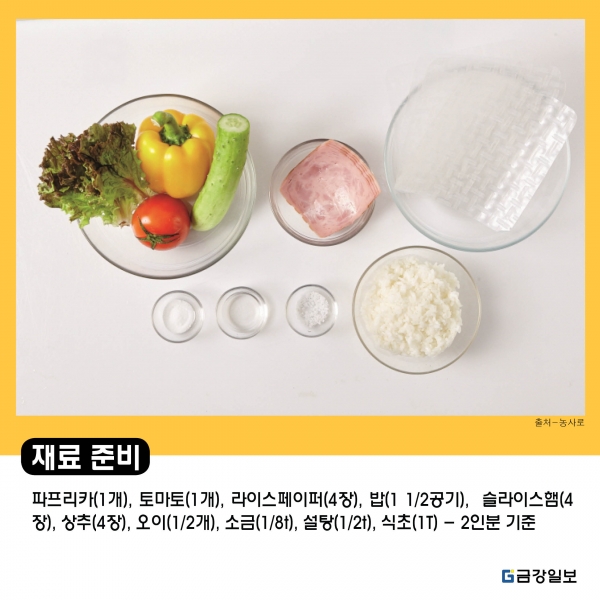 <2인분 기준> 파프리카(1개), 토마토(1개), 라이스페이퍼(4장), 밥(1 1/2공기), 슬라이스햄(4장), 상추(4장), 오이(1/2개), 소금(1/8t), 설탕(1/2t), 식초(1T)