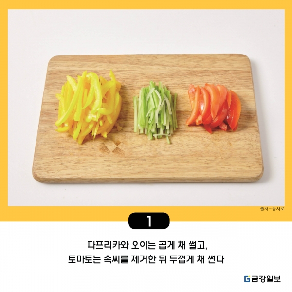 1. 파프리카와 오이는 곱게 채 썰고, 토마토는 속씨를 제거한 뒤 두껍게 채 썬다.