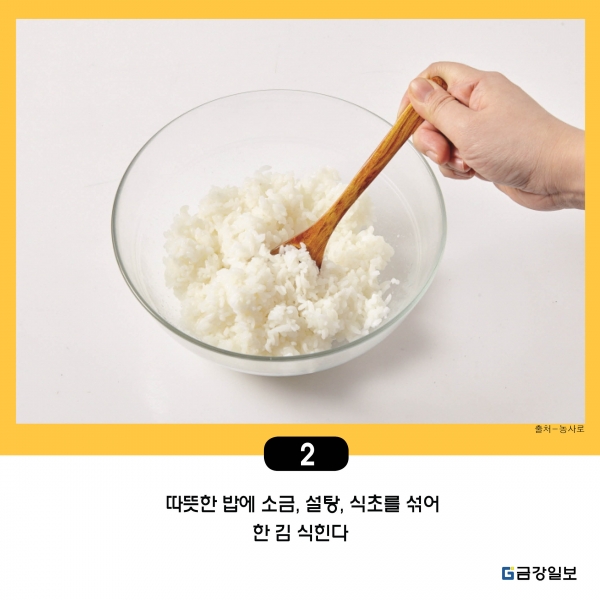 2. 따뜻한 밥에 소금, 설탕, 식초를 섞어 한 김 식힌다.