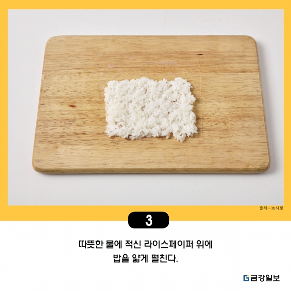 3. 따뜻한 물에 적신 라이스페이퍼 위에 밥을 얇게 펼친다.