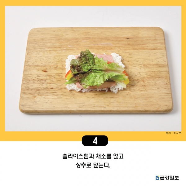 4. 슬라이스햄과 채소를 얹고 상추로 덮는다.