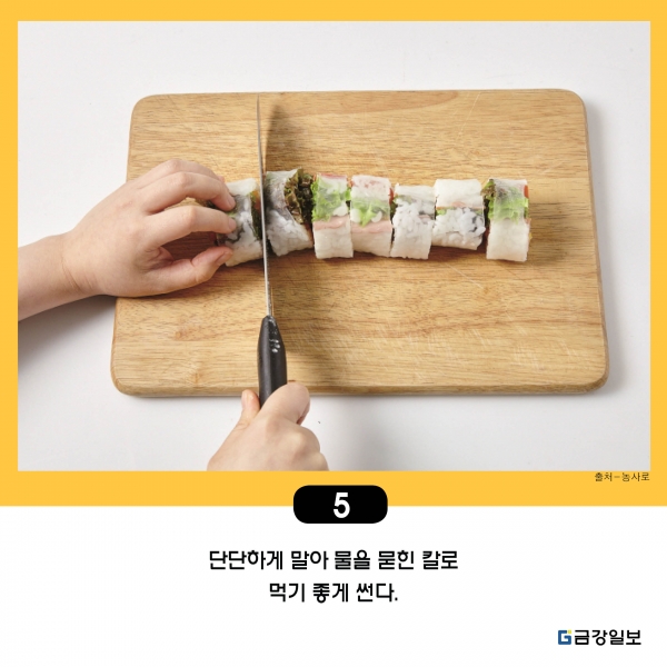 5. 단단하게 말아 물을 묻힌 칼로 먹기 좋게 썬다.