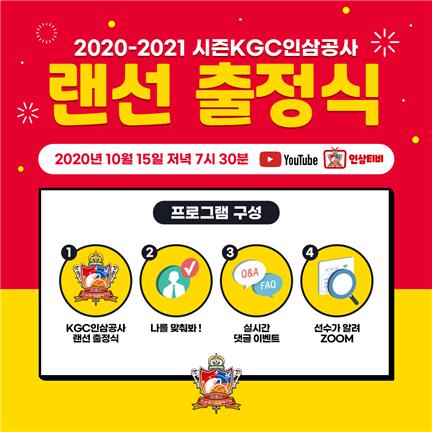 [금강일보 강정의 기자] KGC인삼공사프로배구단은 15일 오후 7시 30분 20-21시즌 랜선 출정식을 개최한다. KGC인삼공사는 시즌 개막을 앞두고 팬들과 함께 새 시즌에 대한 각오와 의지를 다지는 출정식을 진행한다.