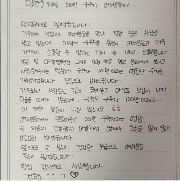 100만 구독자를 달성한 임영웅은 구독자들에게 감사 인사를 드리기도 하였다. 지난 22일 임영웅은 자신의 유튜브 채널에 “행복한 날 만들어주셔서 감사드립니다, 모두 좋은 날 되세요. 사랑합니다 ❤”라는 글과 함께 직접 쓴 글을 게재했다.