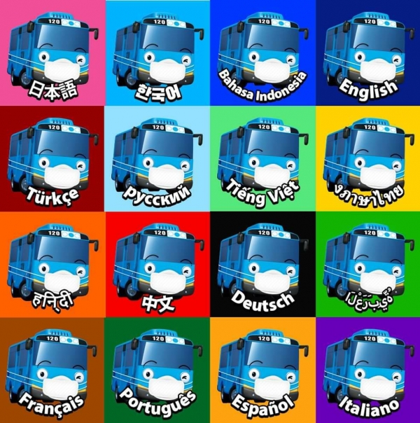 그러한 인기에 꼬마버스 타요는 자신들의 콘텐츠를 다양한 나라의 언어로 선보이기도 한다. 그 대표적인 예시로는 최근 코로나19로 인해 마스크 사용을 선도하는 사진을 다양한 나라의 언어로 표현한 사례를 들 수 있다.