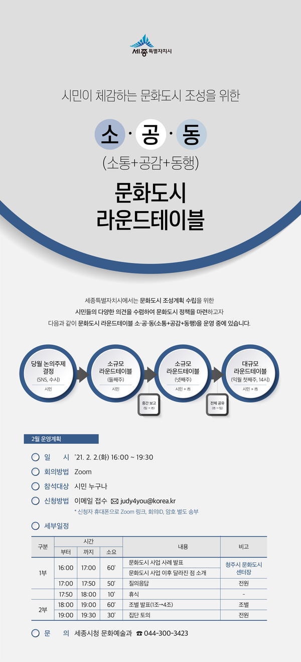 세종특별자치시(시장 이춘희)가 내달 2일 온라인 개최 예정인 ‘소·공·동(소통+공감+동행) 문화도시 라운드테이블’의 참여자를 26일부터 모집한다. 문화도시 라운드테이블은 시민들이 일상에서 느끼는 문화적 도시문제를 함께 진단하고 해결책을 찾아 문화도시 사업과제를 발굴하고자 운영하고 있다.