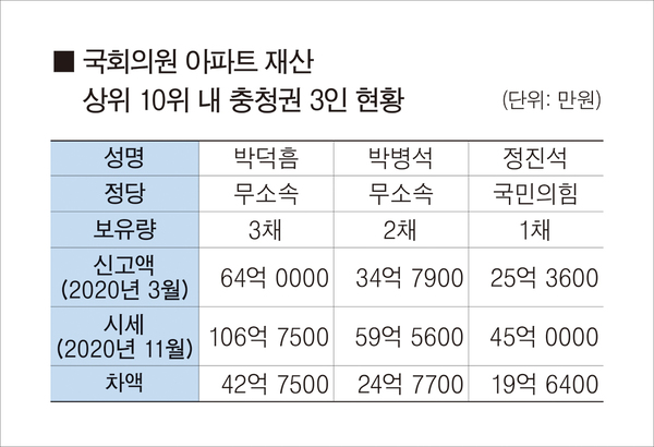이들 중 충청권 의원 3인이 보유한 아파트 소재지는 박덕흠 의원의 경우 서울 강남구 및 송파구, 충북 옥천에 각 1채, 박병석 의원은 서울 서초구 및 대전 서구에 각 1채, 정진석 의원은 서울 강남구 1채 등이다.