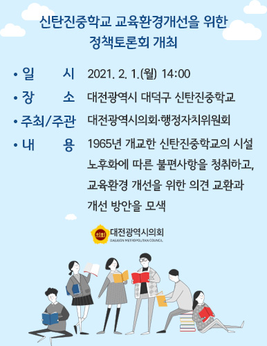 행자위 부위원장인 문성원 의원(더불어민주당·대덕구3)이 좌장을 맡고, 이재홍 신탄진중 교장, 노지희 신탄진중 운영위원장, 이승진 동부교육지원청 시설과장, 조광민 시교육청 시설1팀장 등이 패널로 참여해 의견을 나눈다.