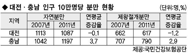 충남은 자연분만이 3.7%(2007년 인구 10만 명당 1042명→2011년 1197명), 제왕절개분만이 2.9%(707→790명) 늘어 16개 시·도 중 네번째로 높은 증가율을 기록했다.