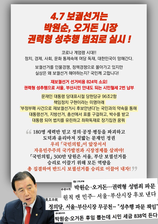 [금강일보 최일 기자] 국민의힘 홍문표 의원(충남 홍성·예산)이 여당의 부도덕성을 부각시키며, 오는 4월 7일 실시되는 서울·부산시장 보궐선거의 실상을 알리는 캠페인에 나섰다.