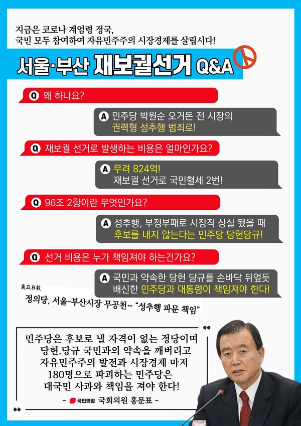 이번 보궐선거는 더불어민주당 소속이었던 박원순·오거돈 전 시장의 권력형 성추행 범죄로 치러지는 만큼 선거에 소요되는 824억 원(서울시장 571억 원, 부산시장 253억 원)의 혈세를 민주당과 문재인 대통령이 책임지고 보상해야 한다고 촉구한 홍 의원은 이 같은 내용을 담은 홍보물을 제작해 SNS(사회관계망서비스)에 게재하고, 300만 당원들에게 호소문을 발송하는 등 대국민 홍보활동을 전개하고 있다.