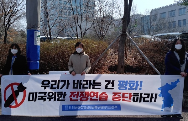 한미연합군사훈련이 지난 8일 개시돼 오는 18일까지 진행되는 가운데, 6·15공동선언실천 남측위원회 대전본부 관계자들이 10일 대전시청 인근에서 훈련의 즉각 중단을 촉구하는 캠페인을 벌이고 있다. 최 일 기자 choil@ggilbo.com