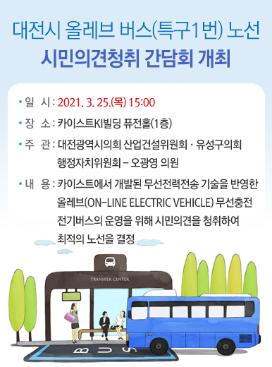 25일 오후 3시 KAIST KI빌딩 퓨전홀에서 열리는 ‘대전 올레브 버스(특구1번) 노선 시민 의견 청취 간담회’는 오광영 시의원(더불어민주당·유성구2)이 좌장을 맡고, 박범산 시 과학산업과 특구협력팀장이 그간의 추진 상황 및 노선안에 관해 설명한다.