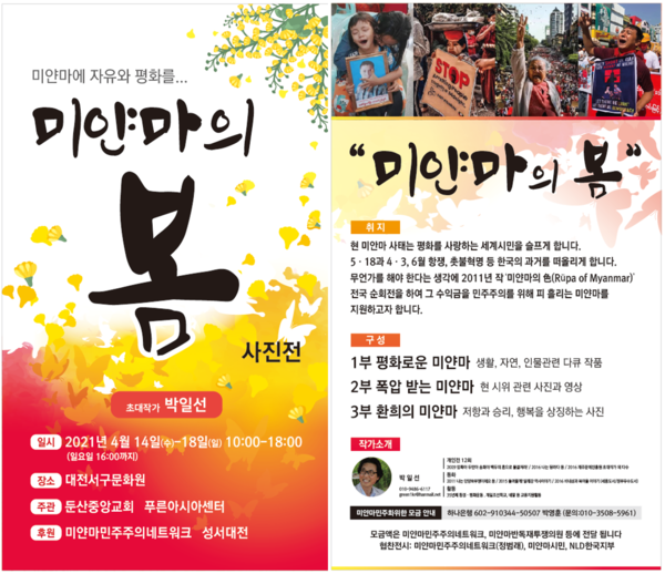 본 사진전은 대전 둔산중앙장로교회, 푸른아시아네트워크 주최, 미얀마민주주의네트워크, 성서대전 후원으로 4월 14일(수)~18일(일) 10시부터 18시까지 (일요일, 16시까지) 대전서구문화원에서 열린다.
