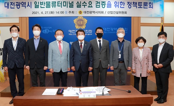 [금강일보 최일 기자] 대전시의회 산업건설위원회(위원장 김찬술, 왼쪽에서 네 번째)는 지난 27일 시의회 대회의실에서 ‘일반물류터미널 실수요 검증을 위한 정책토론회’를 개최, 현행 일반물류시설 개발의 문제점을 진단하고 개선 방안에 관해 심도 있는 논의를 했다. 대전시의회 제공