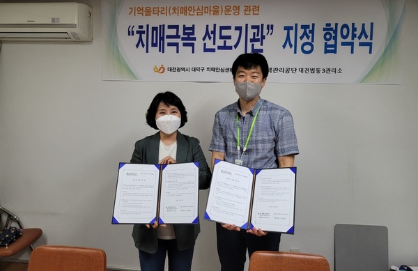 [금강일보 최일 기자] 주택관리공단 대전법동3관리사무소(소장 이우희, 왼쪽)는 지난 28일 대덕구 치매안심센터(센터장 김주연)와 입주민을 위한 치매교육 및 정보 제공에 관한 협약을 맺었다. 치매안심센터는 법동3관리사무소를 치매극복 선도기관으로 지정하고 현판식을 가졌다. 주택관리공단 제공
