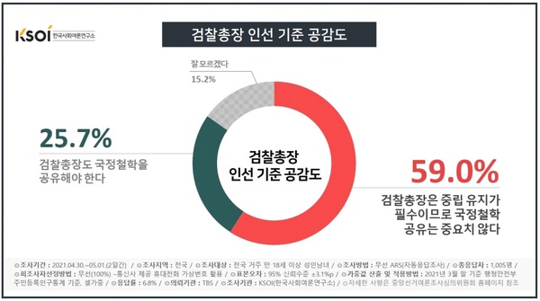 한국사회여론연구소(KSOI)가 지난달 30일과 이달 1일 전국 만 18세 이상 남녀 1005명을 대상으로 박 장관이 제시한 검찰총장 인선 기준에 관해 의견을 물은 결과, 전체의 59.0%가 ‘검찰총장은 중립 유지가 필수이므로 국정철학 공유는 중요치 않다’라고 응답했다. 반면, ‘검찰총장도 국정철학을 공유해야 한다’라는 답변은 25.7%에 그쳐 부정적 여론이 긍정론에 비해 2배 이상 높았고, ‘모르겠다’는 15.3%로 집계됐다.