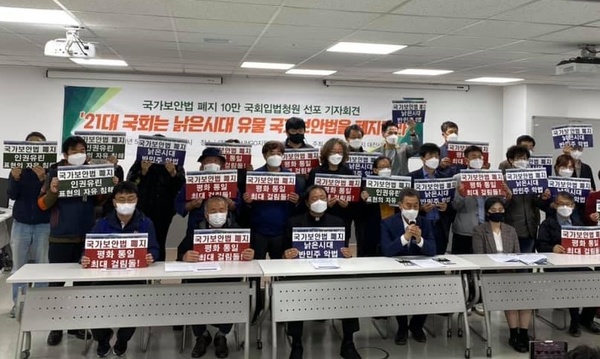 국가보안법을 반민주·반인권·반통일 악법으로 규정하는 대전지역 60개 시민사회단체가 21대 국회에서의 국보법 폐지를 목표로 ‘국가보안법폐지대전시민행동’을 결성, 지난 10일 대전NGO지원센터에서 10만 국회입법청원운동(내달 10일까지 진행) 선포 기자회견을 갖고 “21대 국회는 낡은 시대의 유물인 국보법을 폐지하라”고 촉구했다. 최 일 기자 choil@ggilbo.com