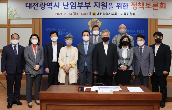 [금강일보 최일 기자] 대전시의회 교육위원회가 주관으로 13일 시의회 대회의실에서 난임부부 지원을 위한 정책토론회가 열려 좌장을 맡은 권중순 의장(가운데), 좌장을 맡은 정기현 의원(앞줄 오른쪽에서 네 번째) 등 참석자들이 기념촬영을 하고 있다. 대전시의회 제공