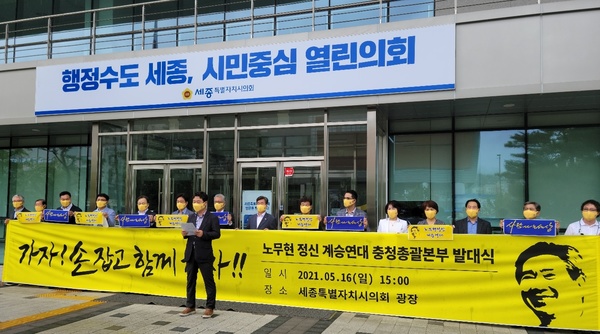 [금강일보 최일 기자] 더불어민주당 김두관 의원 지지 조직인 ‘노무현정신계승연대’ 충청총괄본부 발대식이 지난 16일 세종시의회 앞에서 열려 박병철 공동대표(전 대전시의원)가 출범 선언문을 낭독하고 있다. 노무현정신계승연대 제공