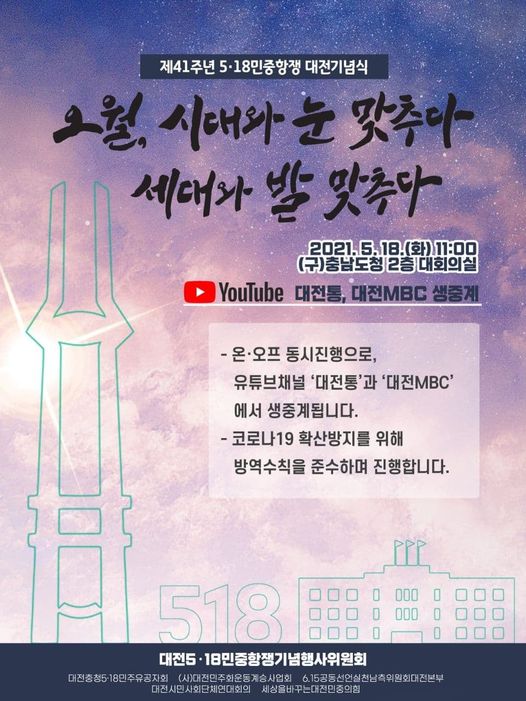 [금강일보 최일 기자] 제41주년 5·18민중항쟁 대전 기념식이 ‘오월, 시대와 눈 맞추다. 세대와 발맞추다’를 주제로 18일 오전 11시 중구 선화동 옛 충남도청에서 열린다.