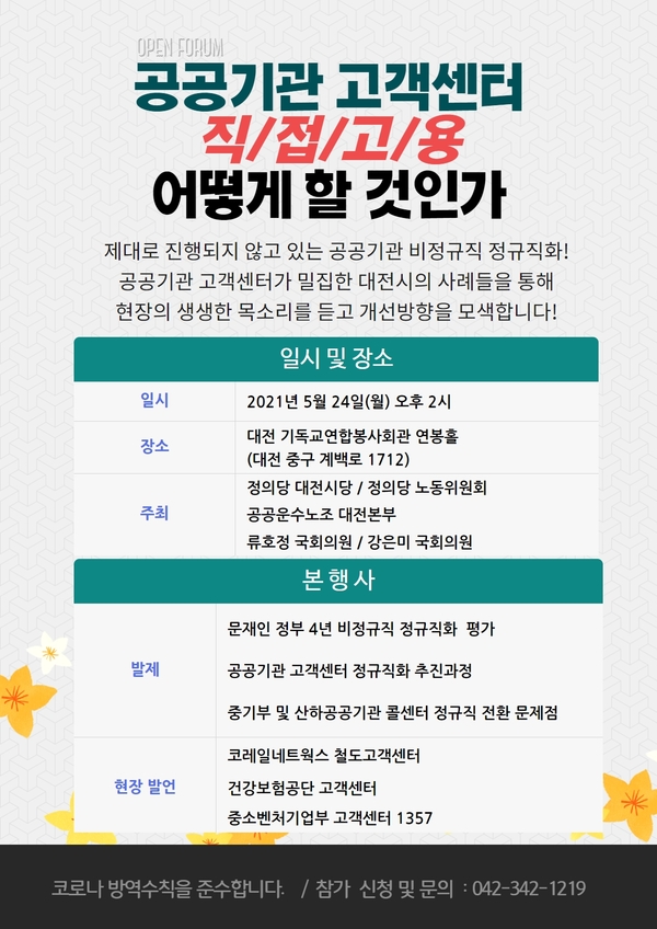 정의당 노동위원회 및 대전시당, 민주노총 공공운수노조 대전본부, 류호정·강은미 국회의원이 공동주최하는 이번 토론회에선 ▲문재인정부 4년 비정규직 정규직화 평가 ▲공공기관 고객센터 정규직화 추진과정 ▲중기부 및 산하공공기관 콜센터 정규직 전환 문제점 등을 다룬다.