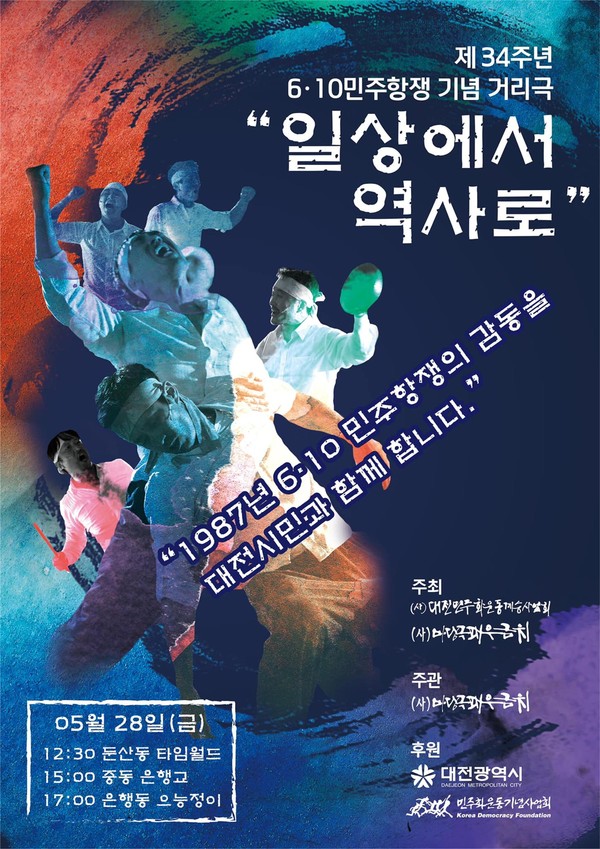 대전민주화운동계승사업회, 사단법인 마당극패우금치는 28일 제34주년 6·10민주항쟁 기념 거리극 ‘일상에서 역사로’를 낮 12시 30분 서구 둔산동 타임월드 앞, 오후 3시 동구 중동 은행교, 오후 5시 중구 은행동 으능정이거리에서 공연한다.