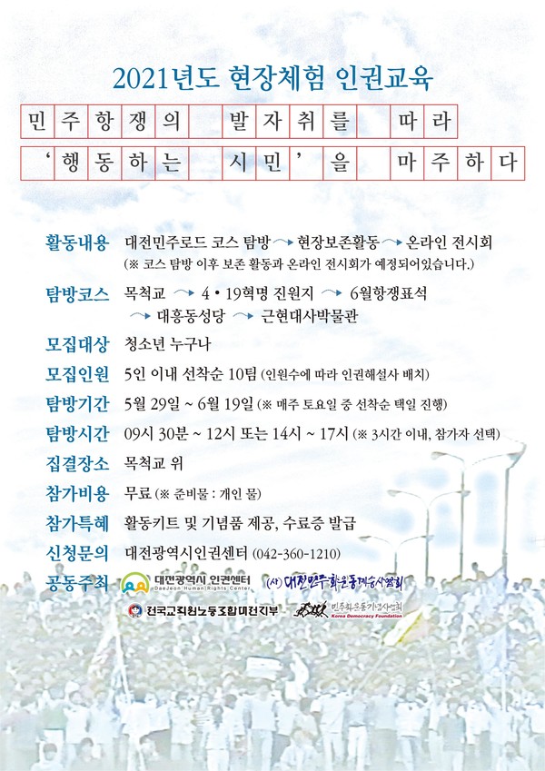이와 함께 내달 1일부터 10일까지 ‘6월 민주항쟁사 사진전’이 대전민주화운동계승사업회, 민주화운동기념사업회 주최로 시청 로비에서 진행되고, 현장체험 인권교육 ‘민주항쟁의 발자취를 따라 행동하는 시민을 마주하다’가 29일과 내달 5·12·19일 대전 민주로드(목척교~4·19혁명 진원지~6월 항쟁 표석~대흥동성당~근현대사박물관)에서 실시된다. 청소년들을 대상으로 한 현장체험 인권교육은 대전시인권센터, 대전민주화운동계승사업회, 전교조대전지부, 민주화운동기념사업회가 함께 마련했다.