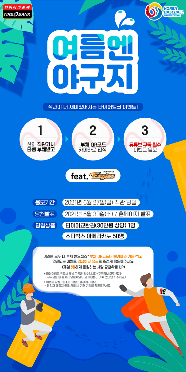 [금강일보 김경락 기자] 타이어뱅크㈜는 오는 27일 대전 한화생명 이글스 파크 홈경기에서 야구장 직관 이벤트 ‘여름엔 야구지’를 실시한다.