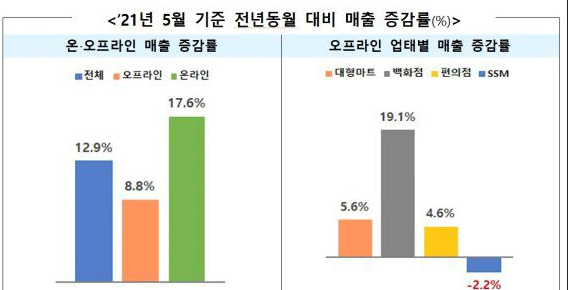 산업통상자원부의 ‘2021년 5월 주요 유통업체 매출동향’ 자료에 따르면 지난 5월 기준 유통업체 매출은 오프라인과 온라인 모두 성장세를 이어가며 전년 동월 대비 12.9% 상승을 기록했다. 올 2월(10%) 이후 3월(18.5%), 4월(13.7%) 등 4개월 연속 두 자릿수 증가세를 보인다.