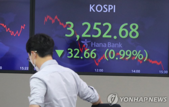 이날 코스피는 전날보다 32.66포인트(0.99%) 내린 3,252.68로 마감했다.