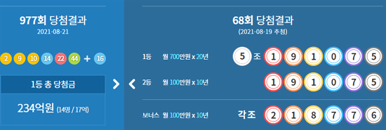 한편 동행복권에 따르면 8월 21일 추첨한 제977회 로또 1등 당첨번호는 추첨 결과 '2, 9, 10, 14, 22, 44'번으로 결정됐다.