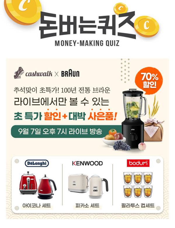 '유한양행·브라운믹서기' 캐시워크 돈버는퀴즈 정답은?