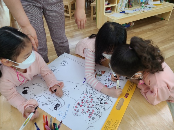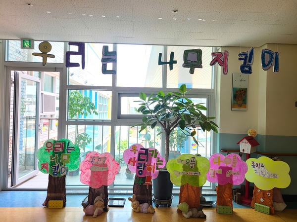 나무가 우리에게 주는 고마움과 소중함에 대해 함께 생각해 보기도 한다. 깨끗한 공기, 책상과 의자, 종이 등 우리에게 주는 것이 많은 나무에게 감사의 편지를 보내고 나무를 소중히 지킬 수 있는 일을 찾아서 실천해 보도록 하고 있다. 나무를 사랑하는 마음과 나무를 지키고 싶은 마음을 담은 ‘지킴 나무’를 만들어 복도에 전시해 나무 사랑 마음을 모든 유아들에게 확산하는 계기를 제공한다. 놀이 활동 중 유아들이 종이를 낭비하는 모습을 사진으로 찍어 재활용하기, 다시쓰기, 아껴쓰기, 종이막대로 활용하기 등 낭비를 막는 방법에 대해 생각해 보는 시간을 갖고 급식시간을 이용해 나무 사랑 캠페인을 전개한 뒤 2층 로비에 캠페인 자료를 전시해 모든 유아들이 나무사랑을 실천할 수 있도록 유도하고 있다.