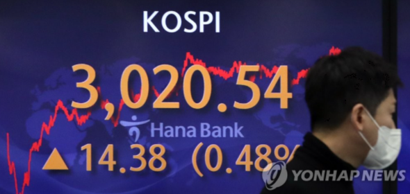 이날 코스피는 전 거래일보다 14.38포인트(0.48%) 오른 3,020.54에 장을 마쳤다.