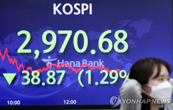 29일 코스피는 전날보다 38.87포인트(1.29%) 내린 2,970.68에 장을 마쳤다. 종가 기준 지난 13일(2,944.41) 이후 가장 낮은 수준이다.