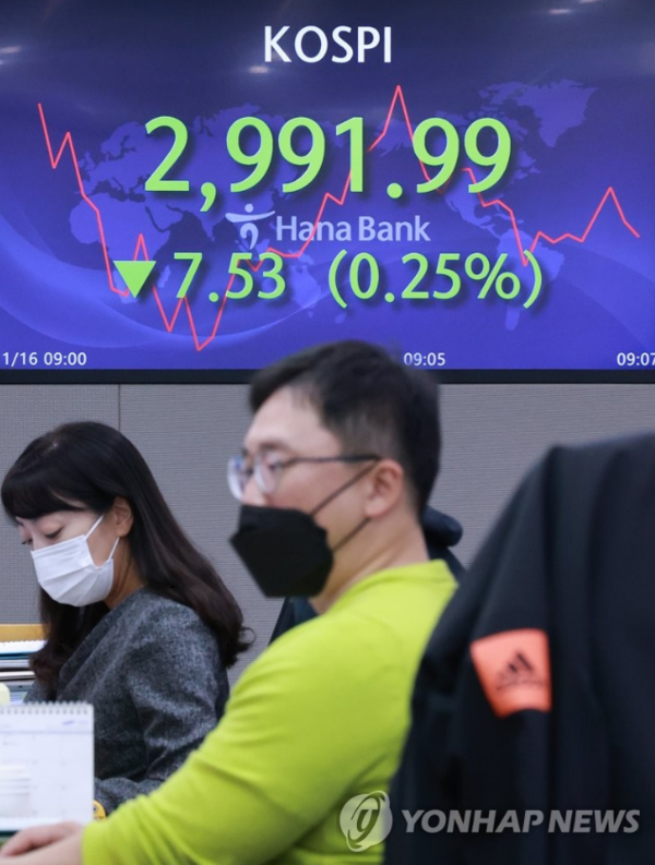 이날 코스피는 전 거래일보다 2.31포인트(0.08%) 내린 2,997.21에 거래를 마치며 사흘 만에 하락 전환했다.
