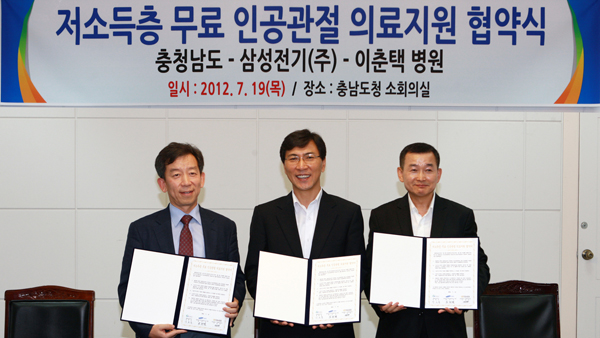 안희정 충남도지사는 19일 도청 소회의실에서 최치준 삼성전기 대표이사와 ‘저소득층 무료 인공관절 의료지원협약’을 체결했다.