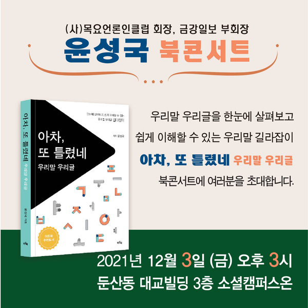 ▲윤성국 금강일보 부회장 출판 기념 북콘서트=12월 3일 오후 3시, 대전 서구 둔산동 대교빌딩 3층 소셜캠퍼스온. ☎010-5403-6888 저작권자 © 금강일보 무단전재 및 재배포 금지 금강일보 admin@ggilbo.com 다른기사 보기 SNS 기사보내기 이메일(으)로 기사보내기 다른 공유 찾기 기사스크랩하기 댓글삭제 삭제한 댓글은 다시 복구할 수 없습니다. 그래도 삭제하시겠습니까? 비밀번호 닫기 기사 댓글 0 댓글 접기 댓글입력 권한이 없습니다. 댓글 내용입력 비회원 로그인 이름 비밀번호 댓글 내용입력 댓글쓰기 계정을 선택하시면 로그인·계정인증을 통해 댓글을 남기실 수 있습니다. 회원 로그인 비회원 글쓰기 이름 비밀번호 자동등록방지 로그인 옵션 창닫기 추천기사 [오늘의 운세] 26일 수요일 나의 운세는? 노타 주가, 급등... 호재는? 카카오톡 친구탭 첫 화면... 내달 원상복귀