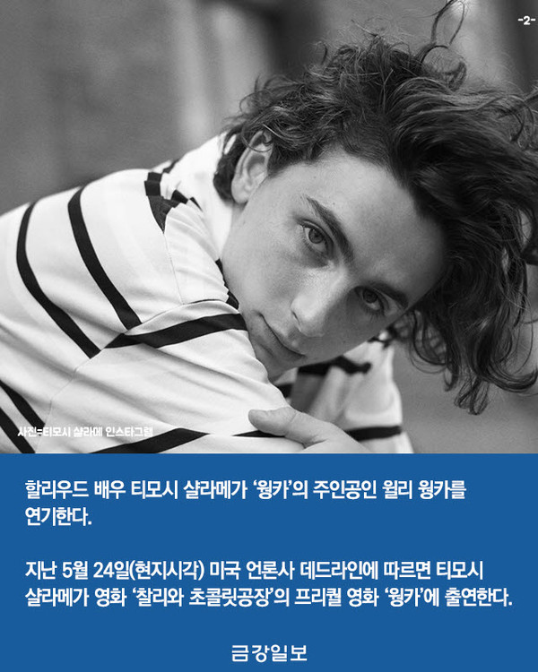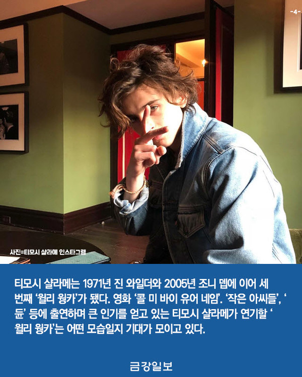 티모시 샬라메, ‘윌리 웡카’로 변신.. 개봉은 언제? 손채현 인턴기자 b_909@naver.com -- 티모시 샬라메, ‘윌리 웡카’로 변신.. 개봉은 언제? 저작권자 © 금강일보 무단전재 및 재배포 금지 손채현 인턴기자 b_909@naver.com 다른기사 보기 SNS 기사보내기 이메일(으)로 기사보내기 다른 공유 찾기 기사스크랩하기 댓글삭제 삭제한 댓글은 다시 복구할 수 없습니다. 그래도 삭제하시겠습니까? 비밀번호 닫기 기사 댓글 0 댓글 접기 댓글입력 권한이 없습니다. 댓글 내용입력 비회원 로그인 이름 비밀번호 댓글 내용입력 댓글쓰기 계정을 선택하시면 로그인·계정인증을 통해 댓글을 남기실 수 있습니다. 회원 로그인 비회원 글쓰기 이름 비밀번호 자동등록방지 로그인 옵션 창닫기 추천기사 [오늘의 금값시세] 11월 26일 금시세(순금·24k)는? 노타 주가, 급등... 호재는? [오늘의 운세] 26일 수요일 나의 운세는?